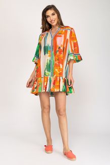 SHORT PRINTED DRESS WITH ELASTIC NECK AND BOTTOM BELL SLEEVE AND DECORATED WITH AVALORIOS